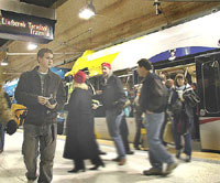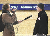 | Episode 11 and 12: Hiawatha Completion December 4, 2004 was the day of the grand opening celebration for the completion of the Hiawatha line. On this day service was extended on the line from Fort Snelling through the airport and on to the Mall of America. Because my video of the June Grand Opening was hampered by camera troubles I was ready to get lots of good video of this day's events, so I had plenty of batteries and my small Canon ZR-65 camera that fit easily in my backpack with my shotgun microphone and headphones. I rode my bus downtown and caught the train to Fort Snelling. This was a couple hours before the line would open the rest of the way, so after getting off the train at Fort Snelling I got on the bus to the airport and the mall. As the bus rounded the corner onto the crosstown highway, a train went over the highway 55 bridge, and I got some nice video of the train passing over us. The celebration was to be in a tent at the Bloomington Central station. As there was no regular bus stop for that station, the driver let us off at a corner about a block away from the station. As I got off the bus, somebody asked me where the celebration was to be. I had seen the tent and pointed that out to him. At that moment I turned and saw that the person who asked me was radio journalist Eric Eskola. I got to the tent a few minutes before the speeches were to begin. I found a good spot near the stage. The area immediately in front of the stage was cordoned off with a fence, so I had to stand behind it. While waiting I saw my old friend Steve Share, and he introduced me to his friend Jeff Syme. It is Jeff's photos that I have placed on the left side of this page. After nearly an hour of speeches, everybody left the tent to greet the arrival of the trains. When the trains pulled up, one going north and one going south, the people standing back applauded. Although the initial rides were only supposed to go to people who had special Hiawatha Line first ride tickets, after all those people had boarded there still was room, so I got on the southbound train, where I did an interview with one of the volunteers from the Minnesota Transportation Museum. I rode the train to the Mall of America station, where I saw Peter McLaughlin, Hennpin County Commisioner, standing. He volunteered to give me an interview. After getting a couple more interviews at the Mall station I caught a train and rode it to the airport. At the airport station: more interviews. I hung out at the table of Transit for Livable Communities and found many people to tell me about their passion for transit. This was uplifting to me. I've always grumbled about how Twin Cities residents don't really understand mass transit, and here I was hearing from so many people who were so enthusiastic about transit, and particularly rail transit. I rode the new section of the line back to Bloomington Central where I did more interviews, then back to the mall, for more. And then once again to Bloomington Central and then I rode a standing room only train back up to downtown Minneapolis after the sun had set beautifully over the Mall of America. The last two interviews I made were two of my favorites. They were with a gentleman who grew up in New York City and rode all around the city on the rail system long before he was a teenager. The last interview was with a man who remembered the last years of the streetcars in the Twin Cities. My body ached the next day from holding my small camera so tight to try to make steady shots. I had recorded five hours of video, from 10 that morning to seven that evening. I edited the tape into two shows. Show #11 looks at the celebration and really looks at the past of transit in the Twin Cities. Show #12 looks toward the future, with information on upcoming transit lines and on the relationship between transit and development and how they can build the Twin Cities of the future. I hope you like the shows. Back to On Transit home Visit Sloppy Films Visit A Carfree Home Page Visit Transit for Livable Communities Visit Metro Transit |